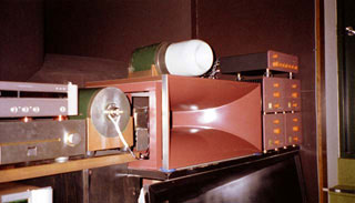 右上から左チャネル部を見たところです。中音用ドライバーが低音用ホーンの一部に食い込んでいます。SATRIチャンネルデバイダの後ろに置いてあるのは、このときまで使用していた真空管アンプです。マランツのプレステージというモノアンプで、845と300Bを使用しています。価格は\250万円/台とか。この後AMP-6510に交換されてしまいました。